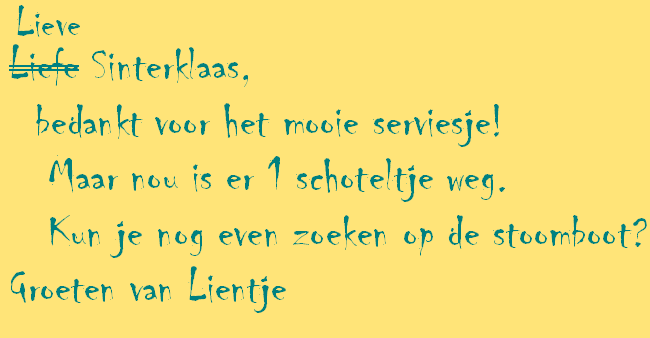 De volgende dag was Lientje weer vroeg op. "Kijk, er zit een briefje in de schoen, en ook weer een pakje!!!" schreeuwde ze. "Ho maar, ik ben niet doof! Wat staat er in de brief?" vroeg ik.