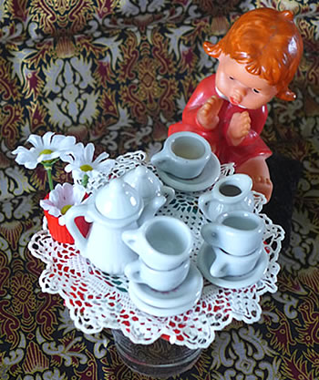 We maakten het pakje open en kijk: er zat een prachtig wit serviesje in en een vaasje met bloemetjes. "Dan kan jij ook eens bij mij thee komen drinken!" juichte ze en ze klapte in haar handjes.